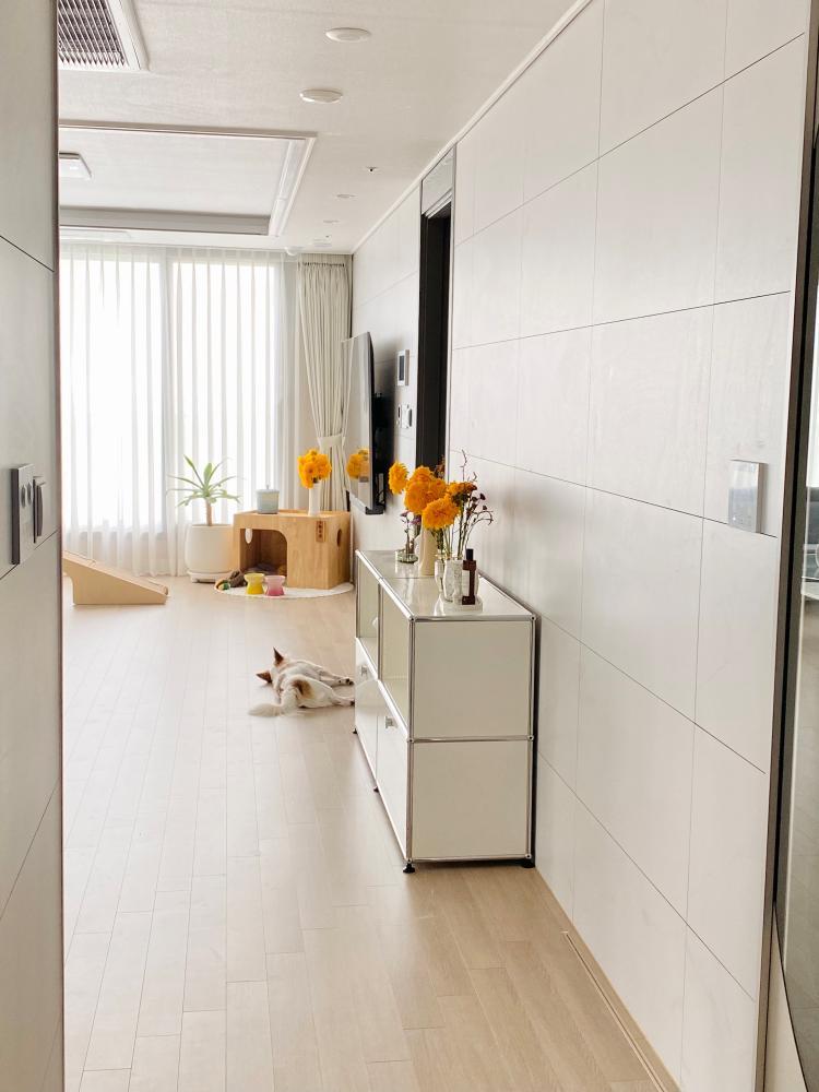 그 위에 꽃이나 장식물들을 활용하니 더욱 더 멋스러움이 더해지네요! 복도와 거실 사이에 모듈가구를 이용하여 다양한 장식물을 올려 인테리어하는 것도 좋은 아이디어같습니다:)!
