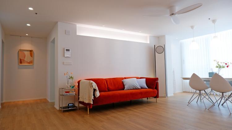 화이트 분위기에 강렬한 레드 소파를 추구하신 리라 고객님의 집입니다. 인테리어 시작 전부터 미드 센추리를 염두에 두시고 인테리어를 하셨는데요. 그덕인지 이렇게 이쁜 미드 센추리 인테리어를 탄생시키셨습니다. 또 하나 직부등을 없애고 간접 등을 이용한 부분도 포인트랍니다.