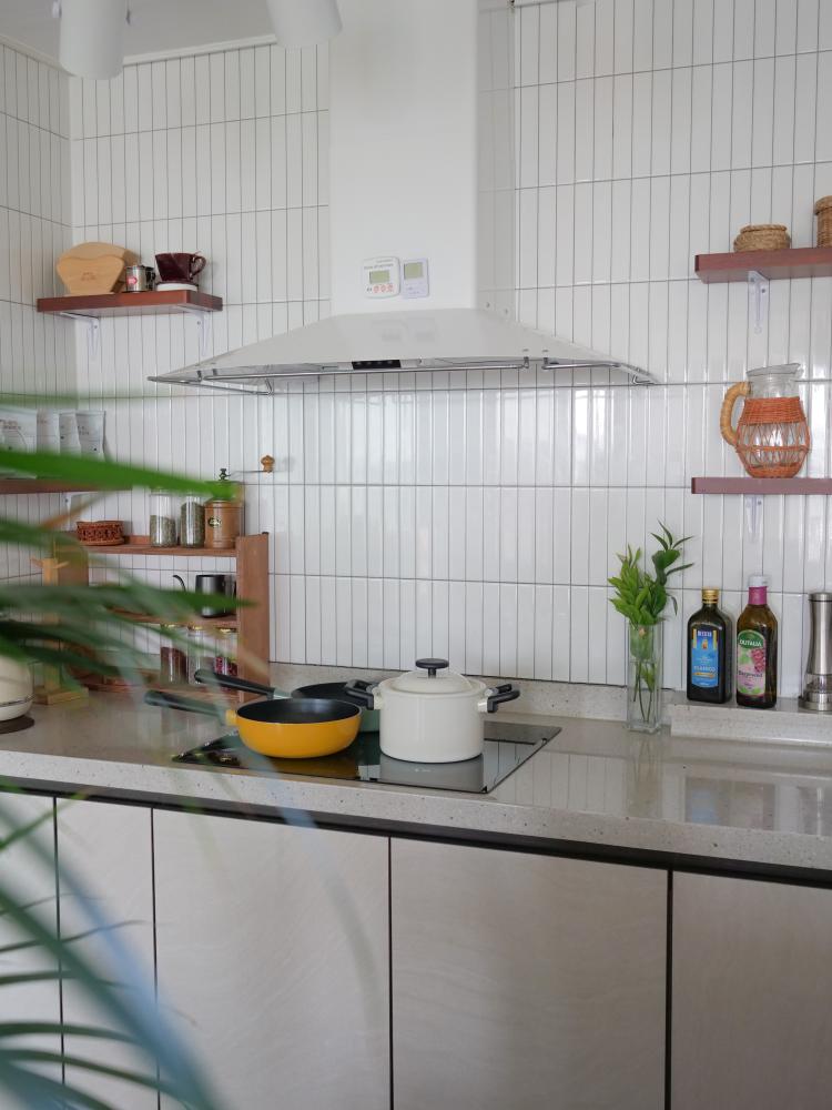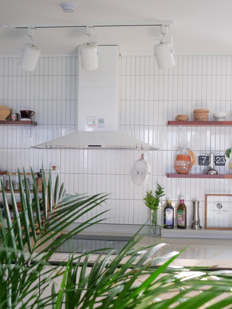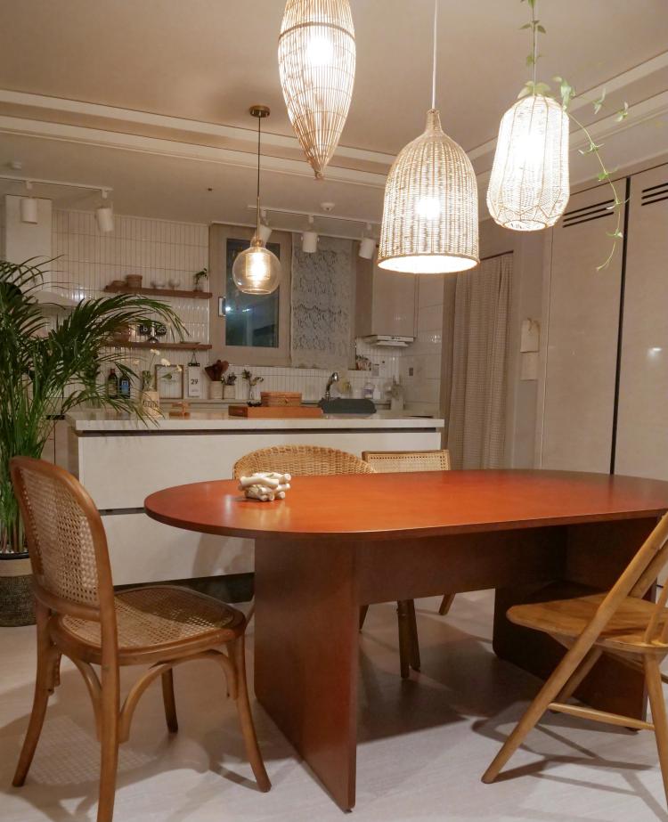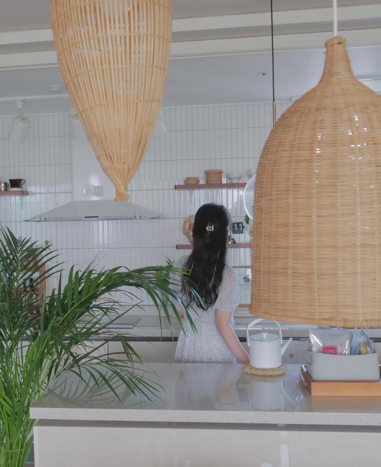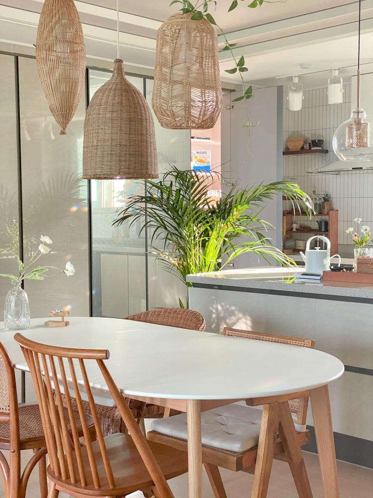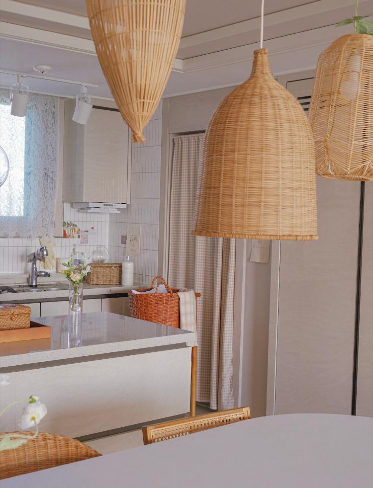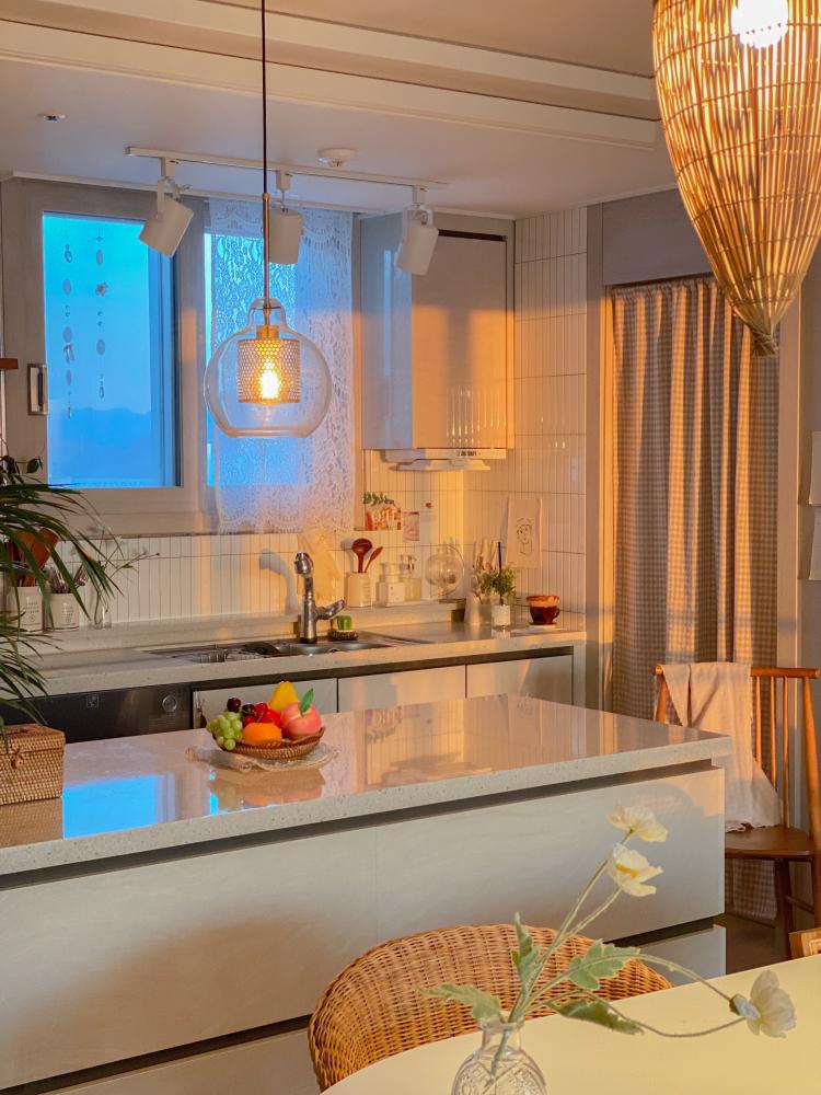 동남아 여행중 직접 데려온 라탄 조명을 달아 더욱 휴양지 같은 분위기가 더해진 주방은 남편의 아이디어로 반셀프 리모델링을 했어요. 요리사는 아니지만 저를 위해 엄청난 세계 요리들을 만들어 주는 남편을 위한 꿈의 주방을 만들어 주고 싶었고 살면서 발품팔아 약 백만원으로 주방을 바꿀 수 있었죠.
