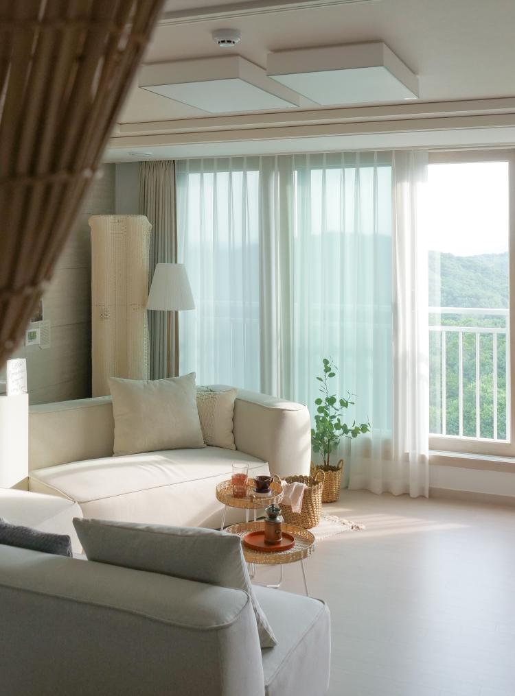 그럼 저희집에서 일몰이 더없이 아름다운 거실부터 소개해볼게요. 창문을 열면 아름다운 새소리와 시원한 숲속의 바람이 불어오는 거실은 남편과 제가 집에서 가장 많은 시간을 보내는 곳이에요.