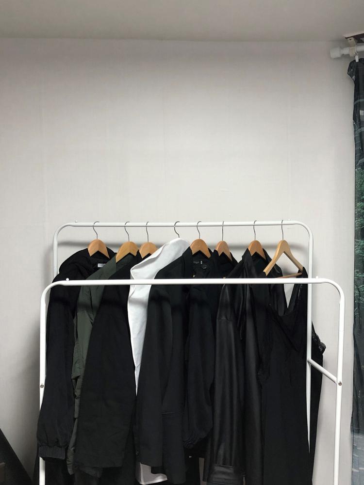 그리고 책상 바로 옆에 비치된 저의 작은 옷방입니다. 그날 입은 옷을 큰 옷장에 수시로 정리하려고 신경쓰고 있지만 입은 옷을 바로 정리하기 힘들더라구요. 2단 행거를 설치해서 요일별로 입을 옷을 미리 정리하고 있어요. 이렇게 정리하니 아침에 시간도 단축되고, 정리 해놓으니깐 훨씬 보기 좋더라구요:)