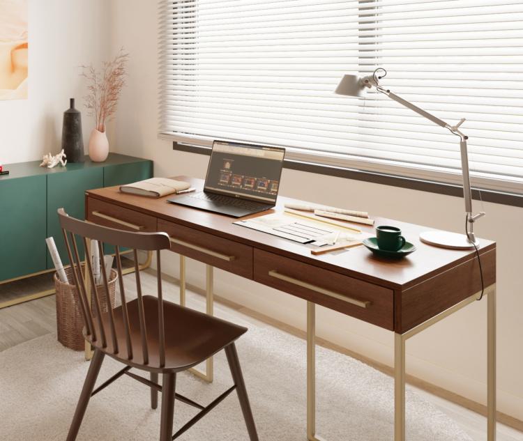 서재의 꽃, 제럴드 책상세트도 소개해 드리겠습니다. 앞서 설명드린 까사미아 수납장과 같은 다크브라운 컬러와 황동 컬러의 조합으로 앤택한 분위기를 자아내는 디자인을 가진 제품인데요. 레트로한 느낌과 함께 까사미아의 고급스러운 분위기를 가지고 있습니다. 이와 어울리는 앤틱한 의자와 조명으로 대표적인 아르떼미데의 플로스 조명으로 집중되는 분위기의 홈오피스 책상을 연출 했습니다.