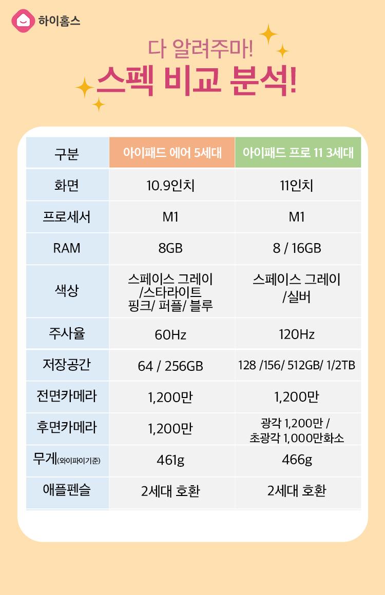애플 공시가격 기준 아이패드 에어 5세대 64GB : 779,000원 / 아이패드 프로 11 3세대 128GB : 999,000원로 약 22만원 차이가 나는데요.