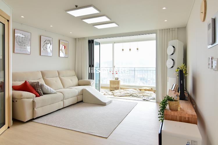 발코니와 이어지는 거실. 발코니처럼 거실도 내추럴하고 따뜻한 분위기로 리프레시 되었어요ㅎ