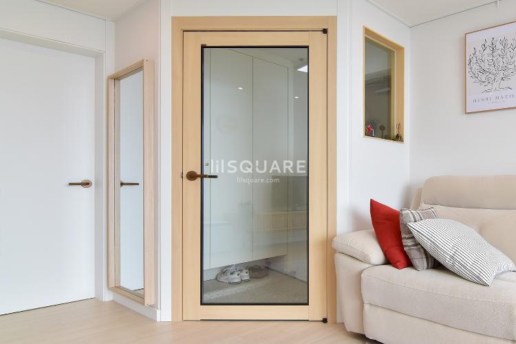 가벽과 더불어 여닫이 중문을 설치하면서 거실의 공간을 최대한 살리는 방안을 고민했고 보시는 것처럼 사선 형태로 중문을 설치해 좀 더 부담없이 공간이 이어지도록 했어요. 하부고시가 없는 중문과 가벽의 픽스창으로 다행히 답답한 느낌은 들지 않는 것 같아요ㅎ