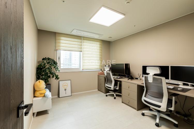 아늑한 침실입니다. 화이트 벽지와 그레이톤 마루. 심플한 컬러감으로 완성된 침실.