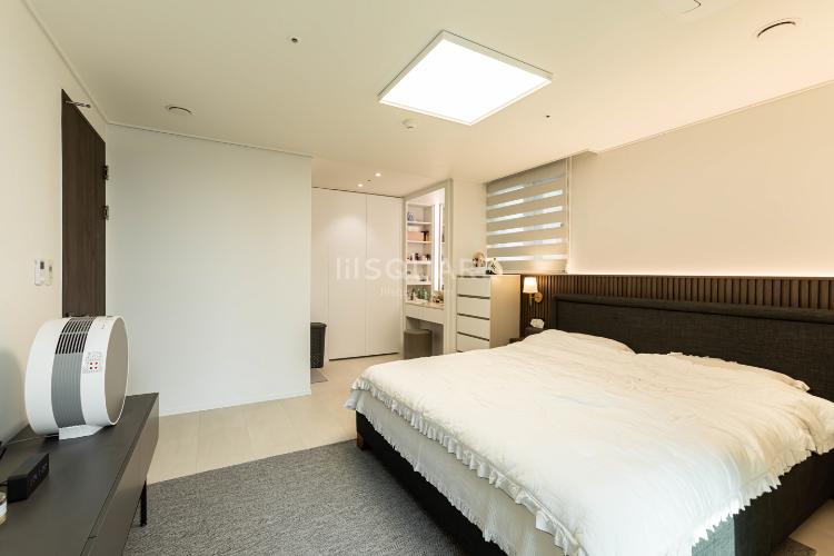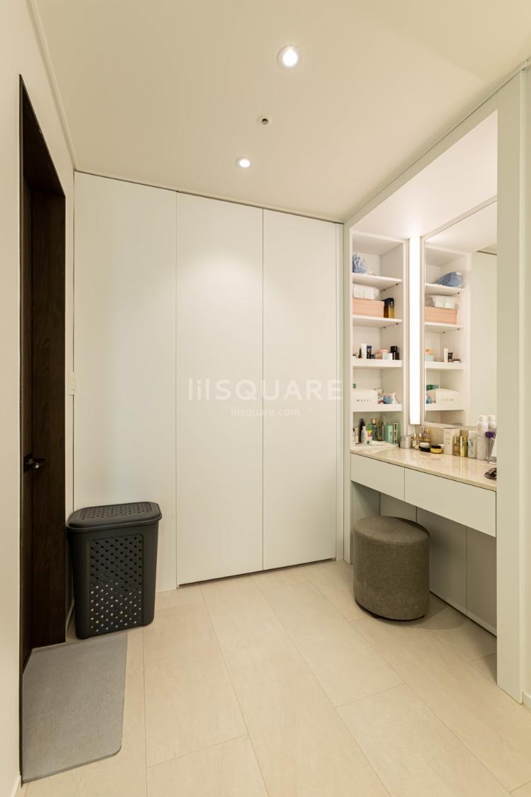 다만, 드레스룸은 변화가 많았어요. 기존 거울이 부착되어 있던 여닫이문을 철거했고, 포켓 슬라이딩 도어로 설치해 공간을 실용적으로 활용했어요. 화이트 컬러를 적용해 깔끔하고 깨끗한 파우더룸 무드를 완성했습니다.