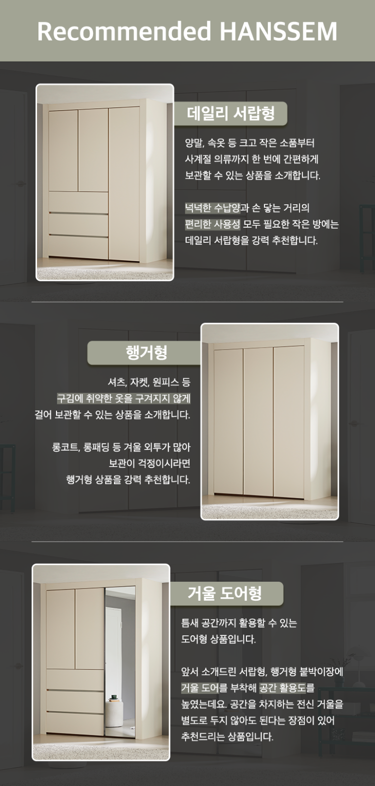 가장 먼저, 평소 수납 습관을 꼭 확인해주세요. 평소 의류를 행거에 수납하는지, 서랍에 수납하는지에 따라 본인에게 맞는 붙박이장 형태가 달라지거든요. 의류가 구겨지는 게 싫어 걸어서 보관하고 싶으시다면 행거형, 두꺼운 의류를 한눈에 보고 정리하고 싶으시다면 선반형, 서랍에 넣어 깔끔하게 정리하고 싶으시다면 서랍형을 추천드려요.