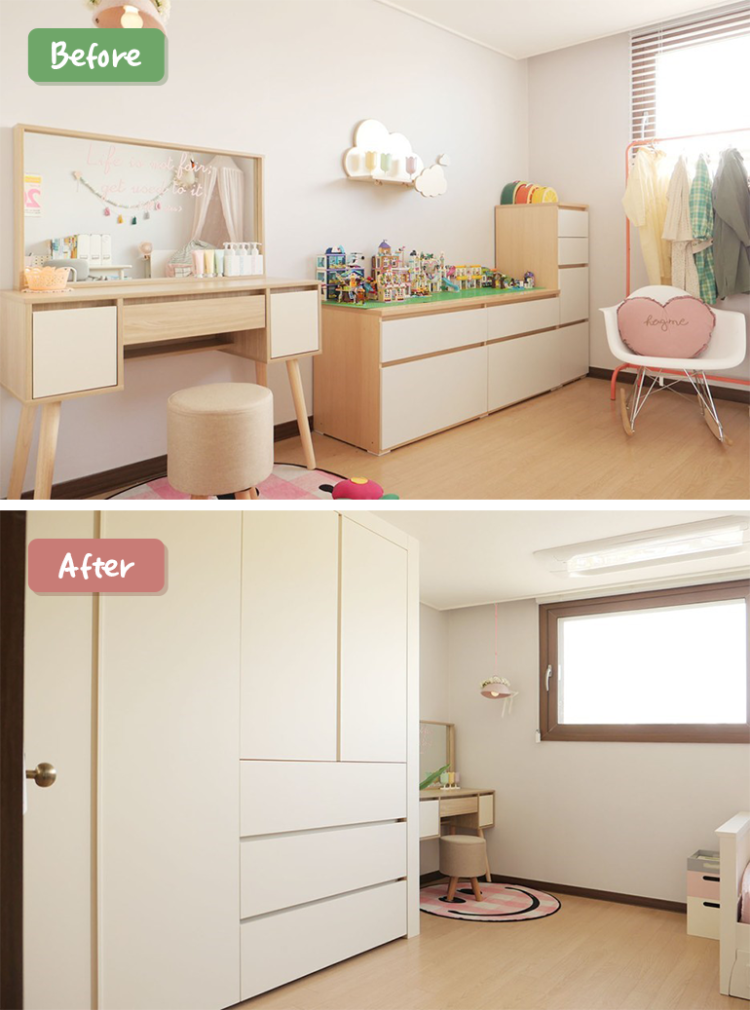 아래 Before & After 사진으로도 고객님께서 어떤 부분이 만족스러웠는지 확인 가능한데요. 화장대, 서랍장의 가구 높낮이가 일정하지 않아 더욱 정돈된 느낌을 받을 수 없었죠. 하지만, 천정까지 깔끔하게 마감 처리된 붙박이장으로 수납은 더 넉넉해지고, 단정한 공간을 완성할 수 있었다고 하네요.