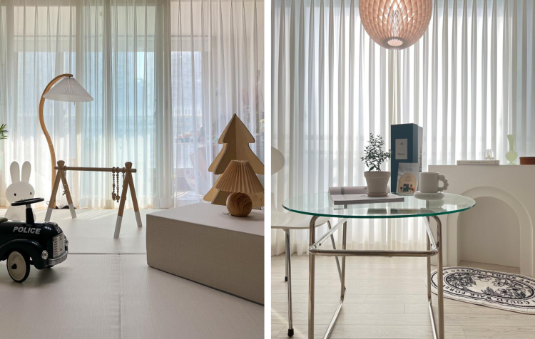 다만 원단이 너무 얇을 경우 커튼의 본질을 잃어버릴 수 있으니 비침 정도를 잘 확인하셔야 합니다. 같은 흰색일지라도 제품에 따라 비치는 정도가 다르니 구매 전 유의하세요!