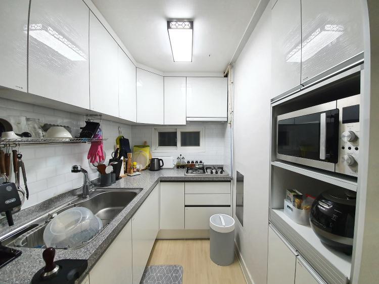 이곳은 우리 집 부엌인데요. 거실과 방이 넓게 빠진 구조라 상대적으로 작습니다. 하지만 ‘ㄷ’자 형태라 요리하기엔 매우 간편해요.
