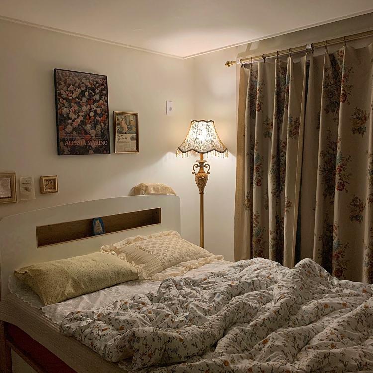 제 집은 분리형 원룸입니다. 이곳은 침실인데요. 사진에서 보시다시피 빈티지, 월넛 컬러의 가구, 플로랄 패턴의 패브릭을 좋아해요.
