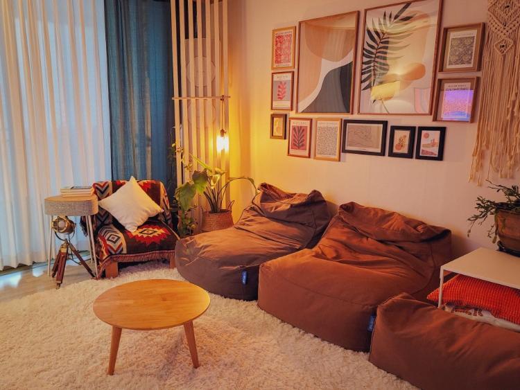 저희 집의 가장 큰 특징은 높은 가구가 없다는 것인데요. 거실에도 커다란 소파 대신 낮고 푹신한 빈백을 배치했습니다.
