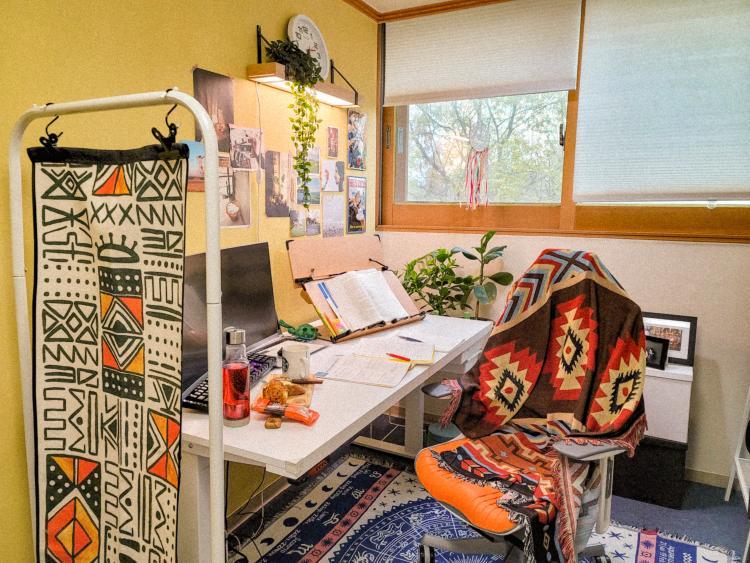 이곳은 노란 벽지가 포인트인 서재입니다. 방의 한 쪽 벽에만 셀프로 페인트를 칠했어요. 칙칙하게 꾸미면 들어가기 싫을 것 같아 노란색으로 포인트를 주고 여러 포인트 소품으로 생기 있는 공간을 만들었습니다.