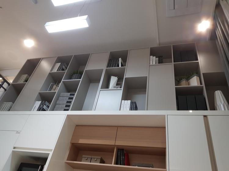 거실 천장이 높아서 거실 한쪽 벽면을 책장겸 수납공간으로 꽉 채워 봤어요.