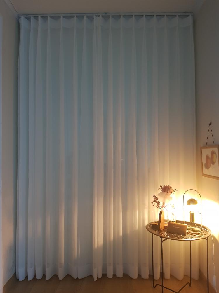 현관에서 들어오면 마주보는 벽면이 큰 거울인데 풍수지리상 좋지 않다고 해서 고민끝에 커튼으로 가렸어요.