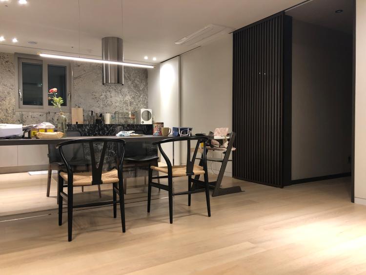 마이너스 옵션으로 아파트를 분양 받고 전체 인테리어를 과감하게 하면서 부엌 상부장 없이 시원하게 구성하고 아일랜드로 인덕션을 끌어와 중간에 원통형의 후드를 노출시켰습니다. 아이를 키우는 집이다 보니 스토케 아기의자를 테이블 끝에 배치했습니다.