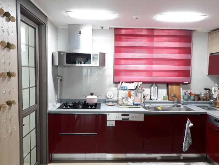 빨간색 싱크대에 빨간색 블라인드로 꾸며봤어요