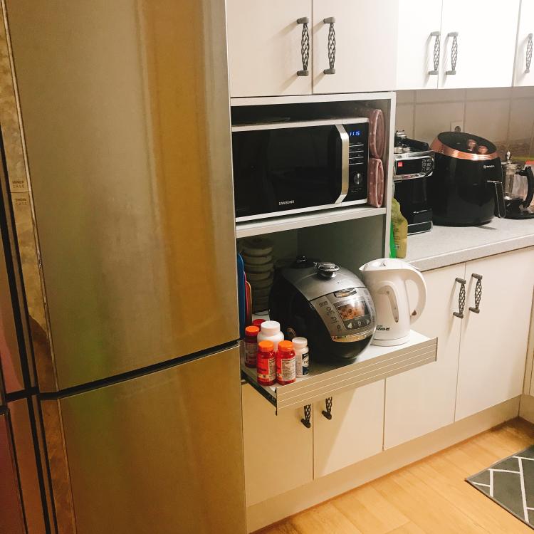 주방에는 삼성 냉장고, 전자레인지, 쿠첸밥솥과 하이마트에서 장만한 웨스팅하우스 대용량 에어프라이어가 요리하기 편한 위치에 배치되어 있어요.