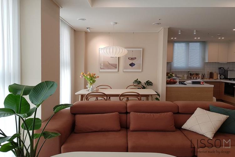 부드러운 베이지톤 페인트와 거실의 포인트를 잡기위해 색을 맞춘 페브릭쇼파, 타워형이라 뒷 수납장을 제거하고 오블리크테이블 식탁과 체코의자를 두었습니다~ 초록색과 어울리는 집이라 식물들이랑 부엌은 깔끔하게 하얀색으로~ 보이는 각도에는 가전이 많이 없네요^^;