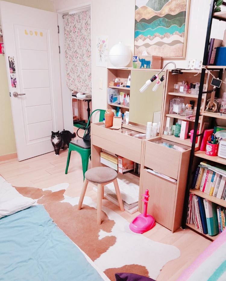 거실이 좁고 방이 커서 방 안에 쇼파랑 화장대랑 책장, 캣폴까지 넣었습니다~ 고양이가 자꾸 따라다니네요
