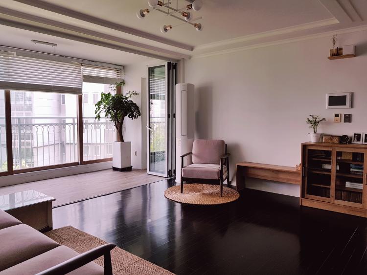 블랙에 가까운 브라운톤 마루로 바닥을 차분하게 연출하고, 나머지는 화이트로 정리했습니다. 그리고 계절에 따라 라탄카페트와 식물 등을 활용해 스타일링을 허고 있어요^^
