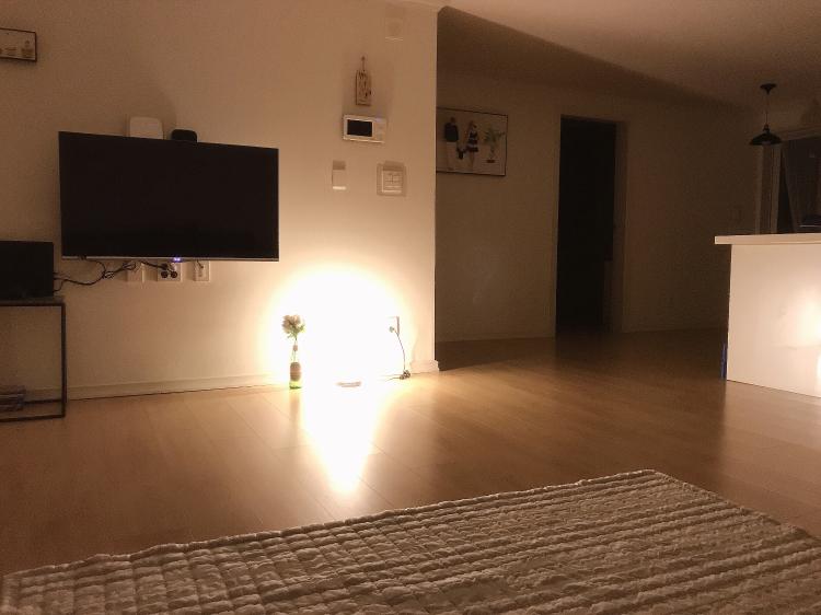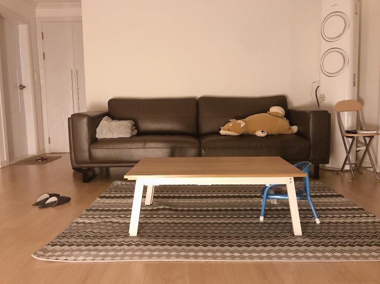 소박한 가구, 가전이지만 밤이면 쇼파위 비워둔 벽면도 스크린이 되어 거실이 영화관이 되는곳