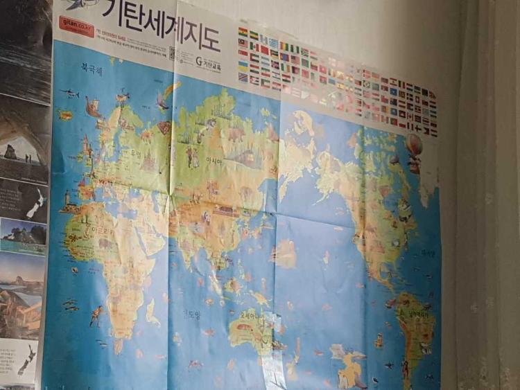 세계지도예요. 벽에 붙여두고 여행다녀온곳을 표시해둬요