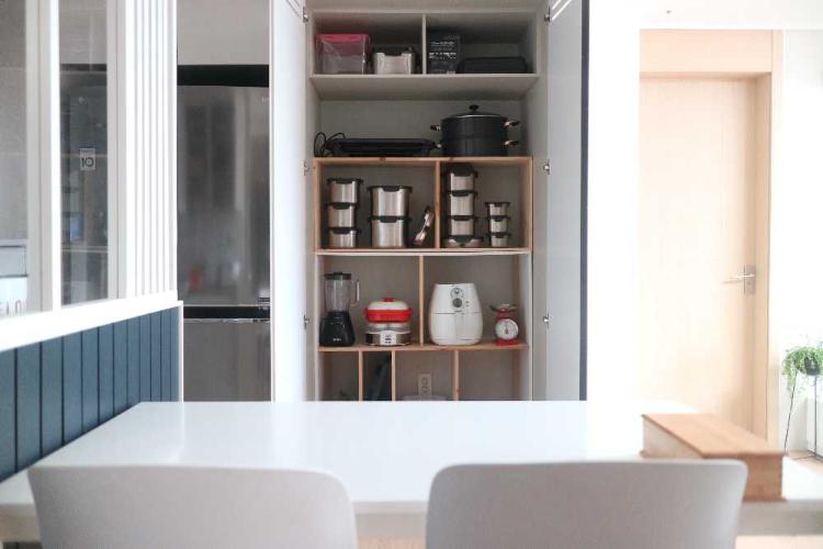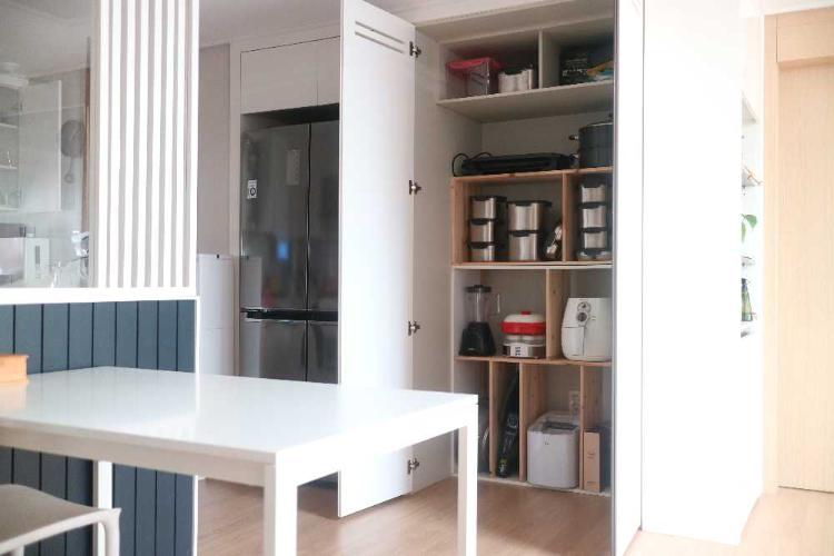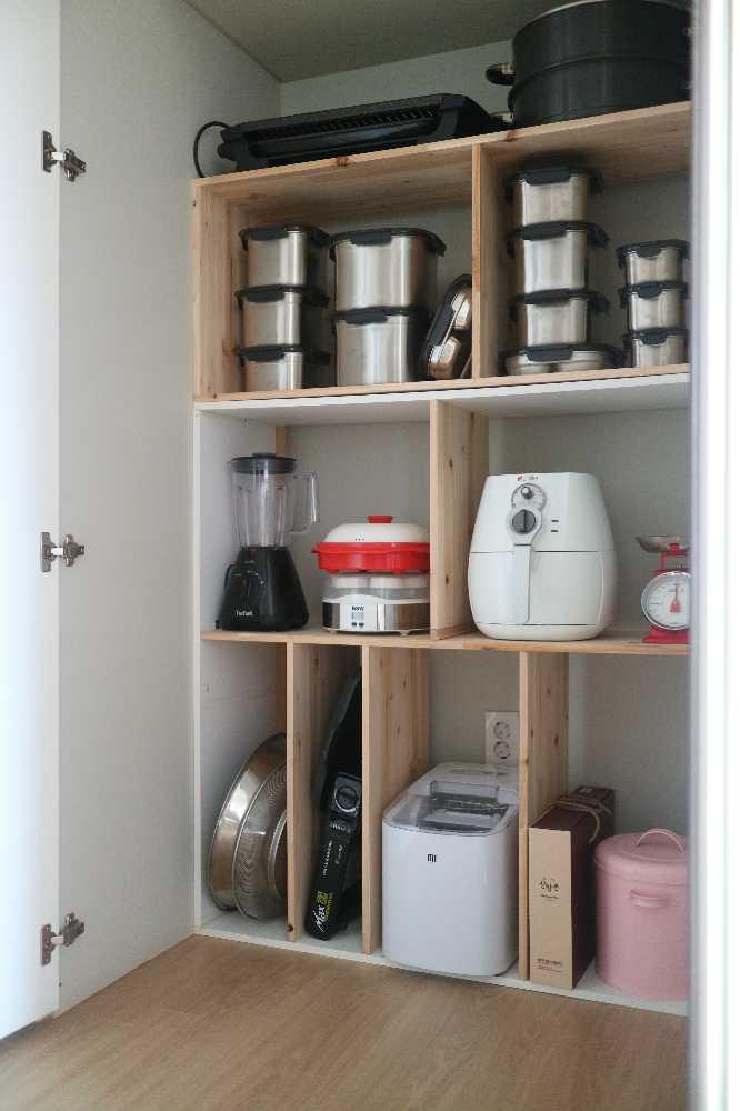 집에 김치냉장고가 없어서 그 자리에 수납장을 만들어 사용하고 있어요.큰 가전 제품들을 넣어 정리하니 주방 싱크대위가 넓어져서 좋아요