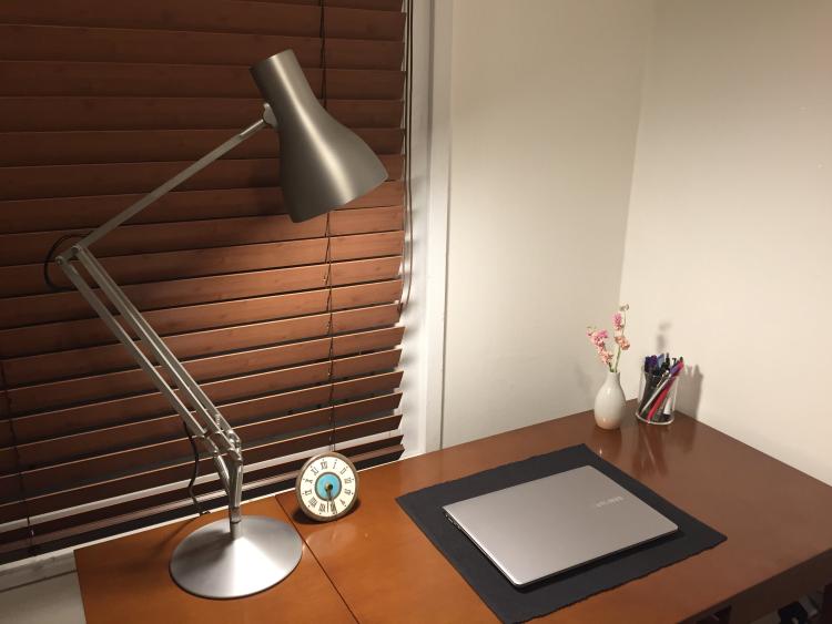 좋아하는 가구 중 하나인 우리집 책상, 그 위에는 언제나 깔끔하고 심플하게 유지하려고 노력 중입니다. 필요한 앵글포이즈 스탠드와 잘 어울리는 삼성 노트북, 그 외 연필꽂이 정도 놓아두고 사용하고 있어요.