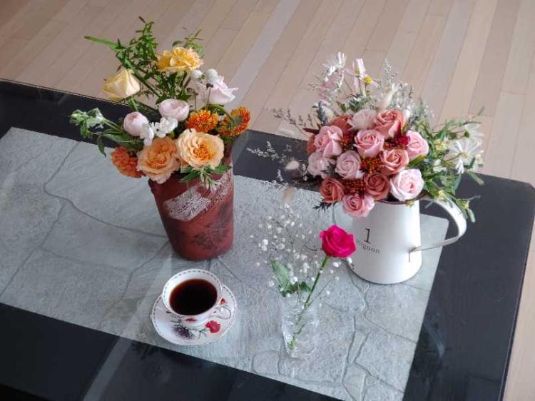 아들의 임용을 축하하는 꽃다발이 있어서 꽃병에 꽂고 커피 한잔 합니다 ㅋ