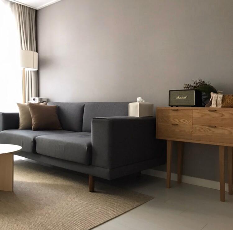 원목과 패브릭으로 포인트를 준 거실입니다.