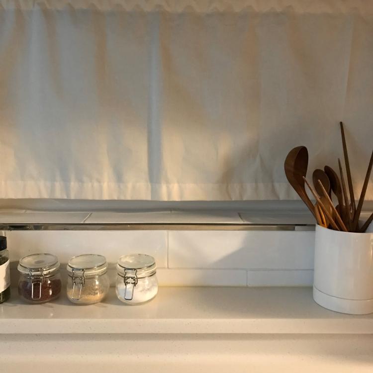 패브릭으로 창문을 가린 깔끔한 주방