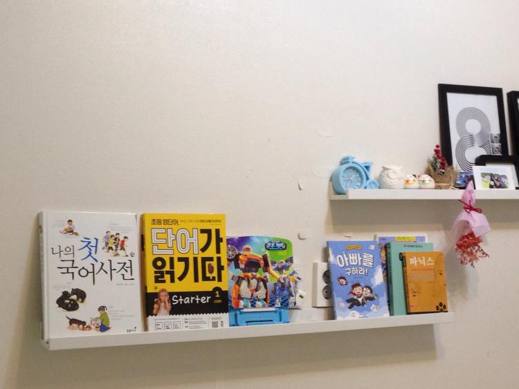 거실 한쪽 벽에 책 선반을 놓았어요