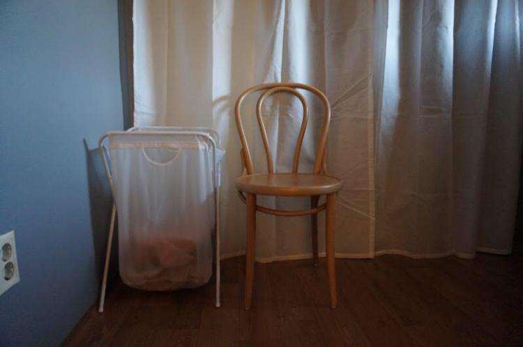 오래된 붙박이장 문을 떼어내고 커튼을 달고 벽면은 회색 페인트로 칠해 옷방을 꾸몄어요. 양말 신을 때 앉을 수 있는 의자를 둬서 편하게 이용하고 있어요~