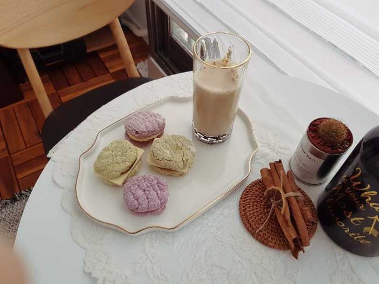 마켓컬리에서 산 사층빵집 다쿠아즈랑 홈메이드로 만든 라떼예요~ 카페 갈 필요가 없죵??