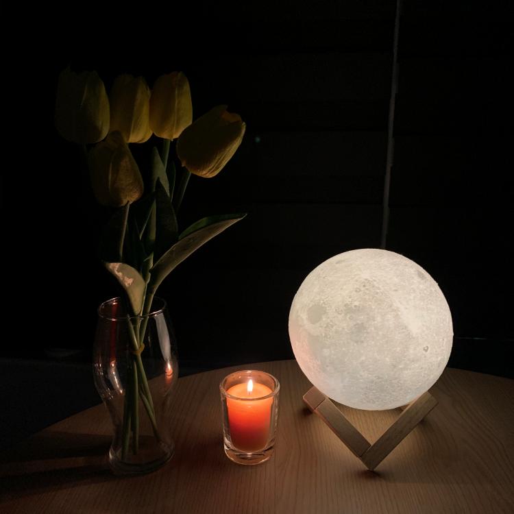 노트북 하는 원형 책상이에요. 생화 꽃구독을 하고 있지만 생화가 빨리 지는게 아쉬워 조화를 샀어요. 달 무드등이랑 양키캔들 보티브의 조화가 좋네요.
