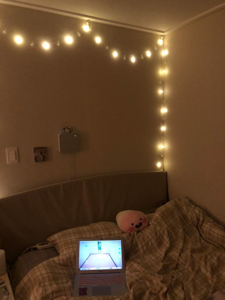 침대 위에 앵두 전구를 달았더니 너무 예쁘네요!