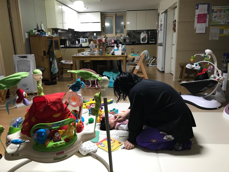 와이프가 생후 6개월 된 아기와 놀아주고 있습니다.
