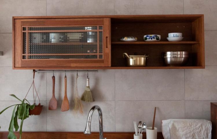 레트로한 찬장과 함께 이케아 레일을 달아서 주방 도구를 걸어 꾸몄어요