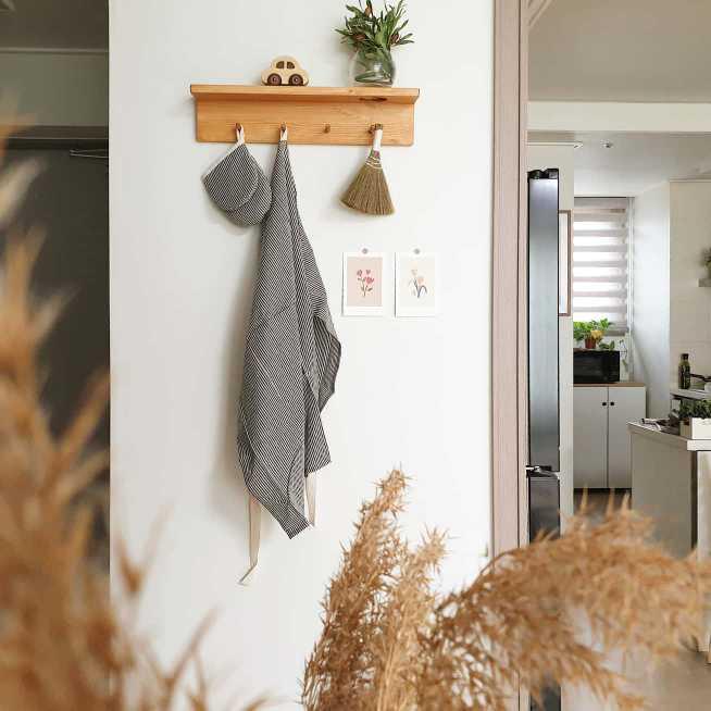 우드로 된 선반을 달아줬더니 따뜻한 느낌으로 맞이해주는 현관 모습이에요.