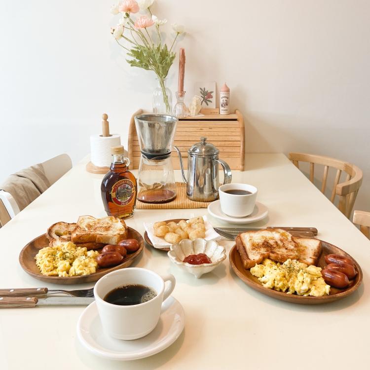오늘 홈카페의 브런치 메뉴는 버터로 구운 밤식빵과 치즈 소시지, 스크램블 에그, 그리고 감자튀김과 커피에요.