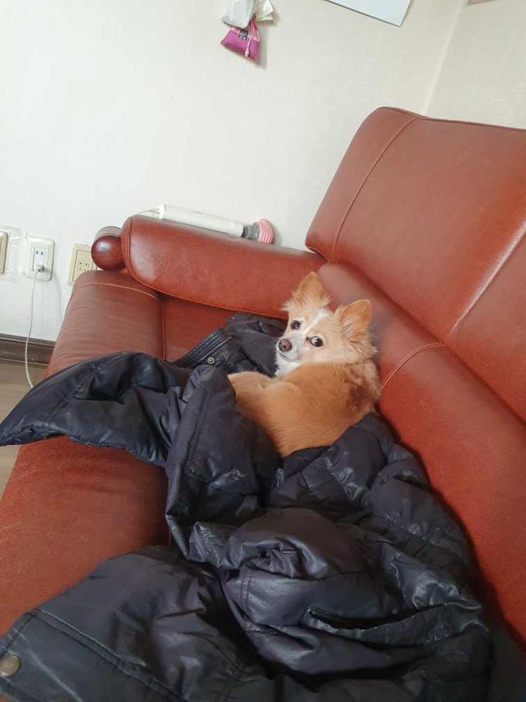 안입는 겨울파카 소파에 깔아주면 울강지 뒹굴고 노는 놀이터가 되네요 ㅋㅋ