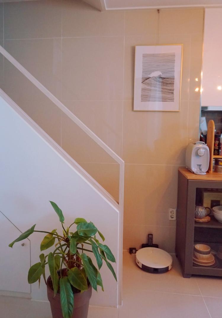 오래보던 유화캔버스 그림을 내린 자리에 판화 느낌의 흑백 프린트 작품을 걸어주었어요. 심플한 저희 집 분위기에 어울리네요^^