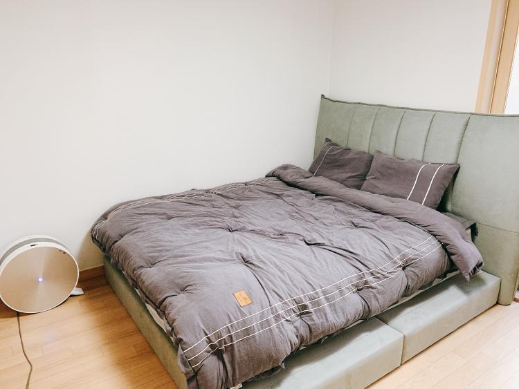 따뜻한 느낌의 샤무드 침대! 매트리스는 에몬스 가구전시장에 가서 직접 누워보고 구입했고 침대 프레임은 가구매장에 가서 직접 원단과 색상 디자인 등을 제작했습니다^^ 국내 생산에 A/S도 가능하고 나중에 질리면 겉에 커버를 교체도 할 수 있다는 점에서 선택했어요~