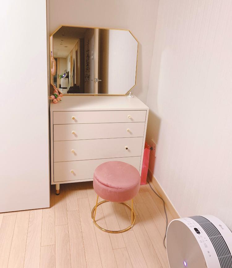 거울 의자 서랍장을 따로 구입해서 완성한 화장대! 제가 드레스룸에서 제일 좋아하고 투자한 가구는 화장대예요 ㅎㅎ 골드포인트로 주고 싶어서 공을 들였는데 만족합니다: )