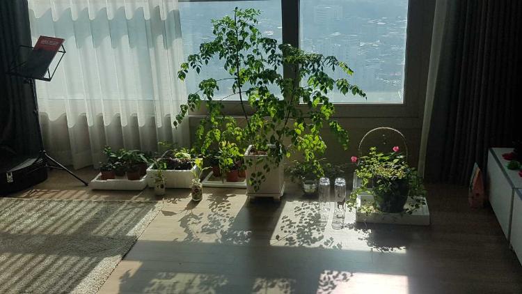 저희 집의 미니 정원이에요. 스티로폼 상자로 화분 받침..^^