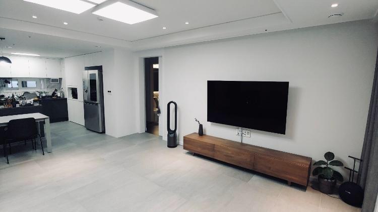제가 제일 마음에 들어하는 사진인데 매번 낙선하여 이번에 재도전 합니다. 35평 4베이 거실이에요. 티비 아래 거실장에는 게임기들이 들어있습니다. 하이마트 광명점에서 구매한 다이슨 tp-04 2년째 잘 쓰고 있고, LG 노크온 냉장고도 좋습니다. 인테리어는 화이트 벽지에 그레이 포세린타일, 우드, 메탈 등의 컨셉으로 잡았습니다