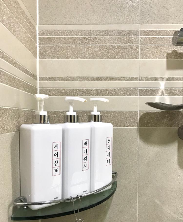 공용욕실이에요~ 강아지들과 함께 쓰는 공간이라 지저분해지기 쉬워서 디스펜서를 통일해서 사용하고 있어요.