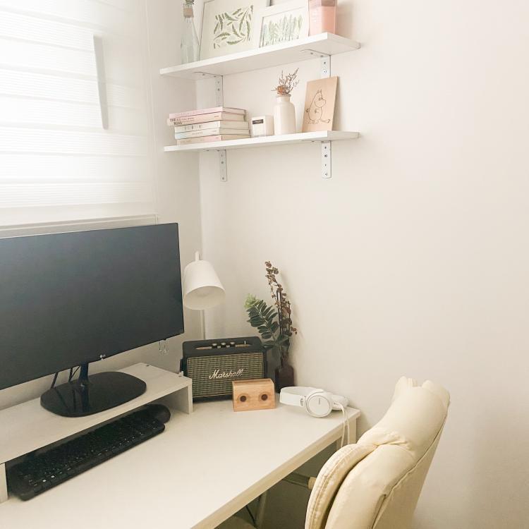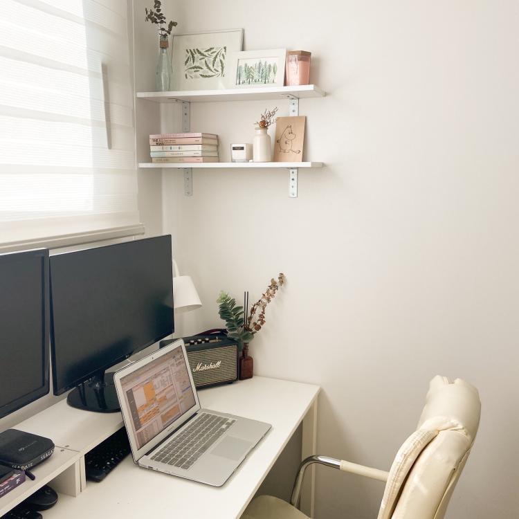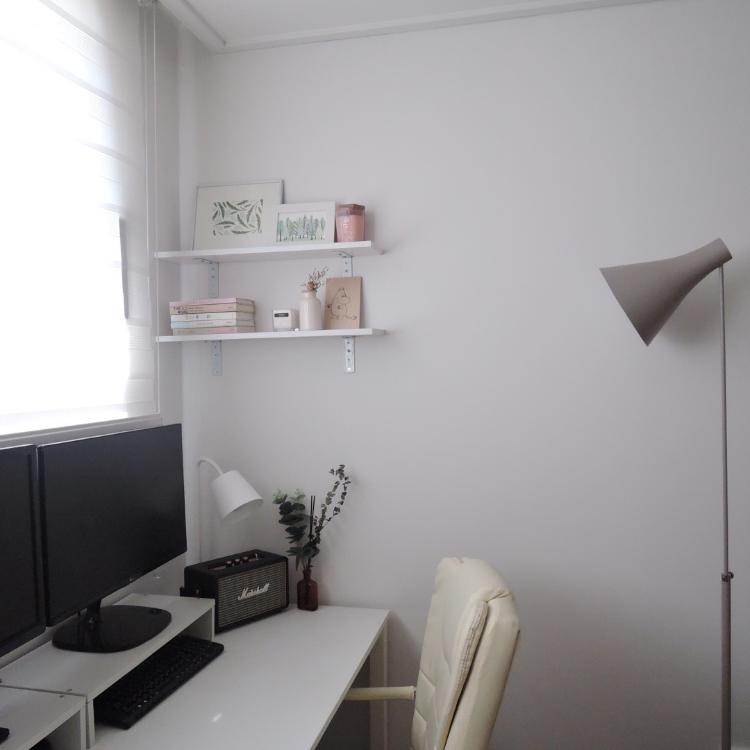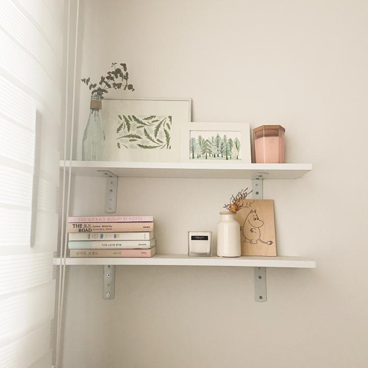 벽면에 붙인 선반엔 책과 갖가지 소품들을 톤 맞춰 올려두었구요.